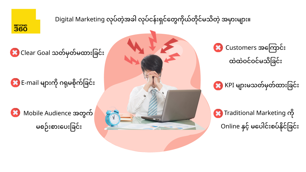အခုပြောမယ့် အချက်တွေက မိတ်ဆွေရဲ့ Digital Marketing Strategy and Planning တွေကို Result မကောင်းတဲ့ အဖြေတွေကနေ လွတ်ကင်းအောင် ထောက်ပြပေးမယ့်၊ Digital Marketing လုပ်တဲ့အခါ လူအများစုမှားလေ့ရှိတဲ့ အမှားတွေပဲဖြစ်ပါတယ်။